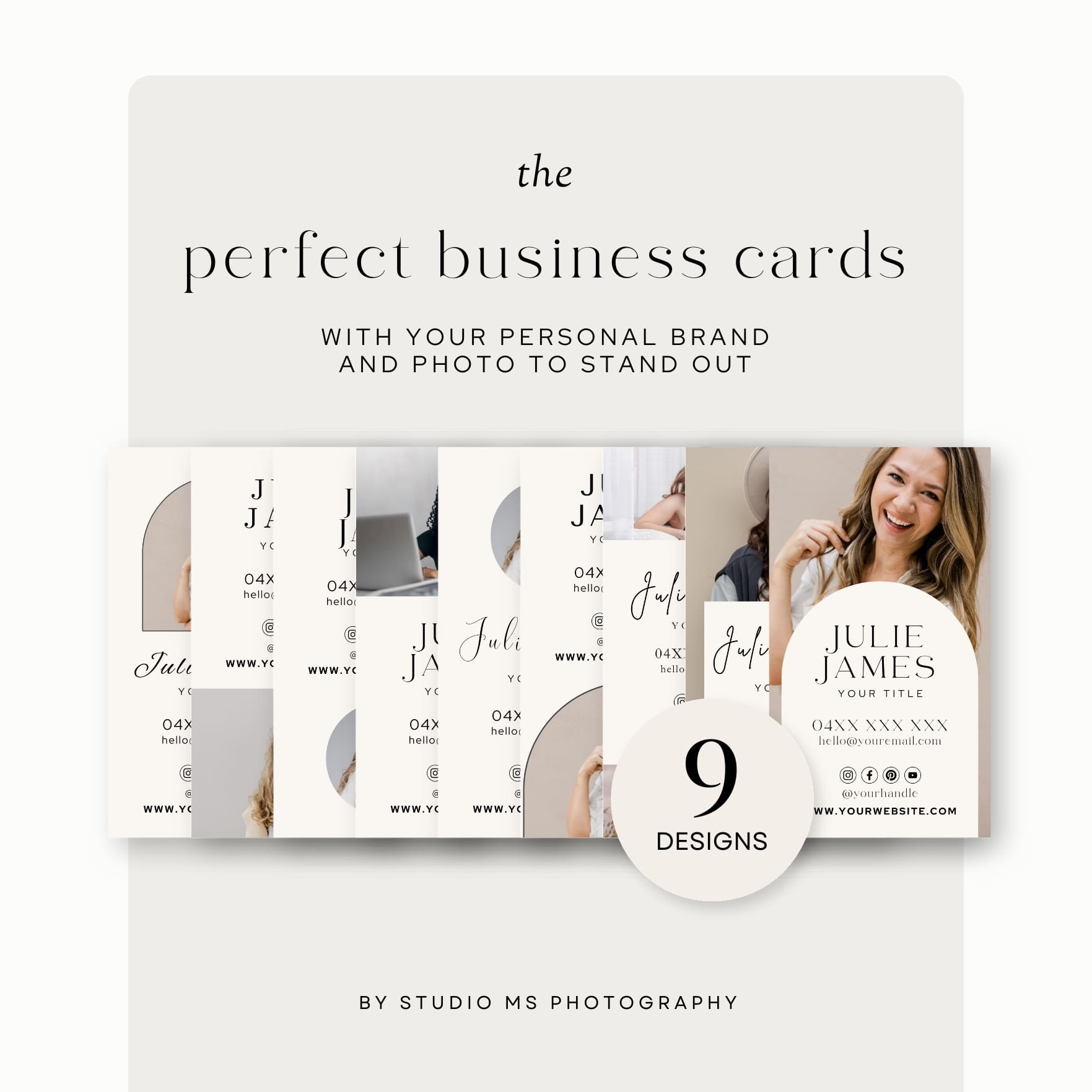Looking for a beautiful design for your business cards with a photo? Then these 9 templates are perfect for you, and the best thing is, is that you can make as few or as many customisations to this template as desired. Perfect as add on to your marketing packet!
